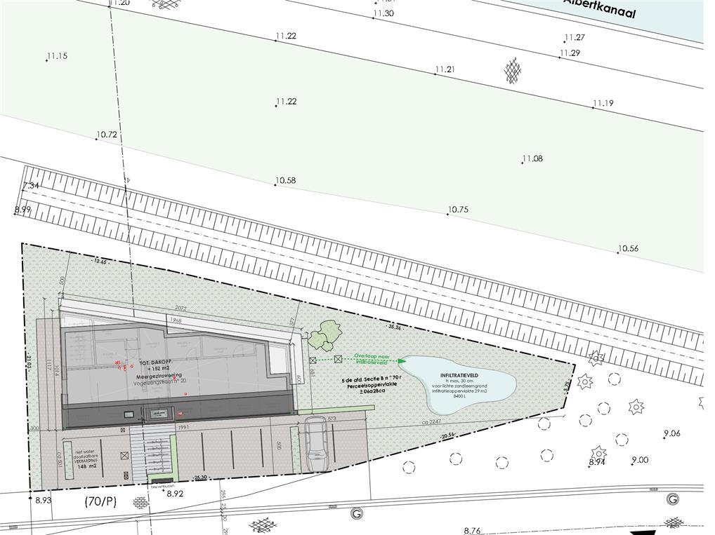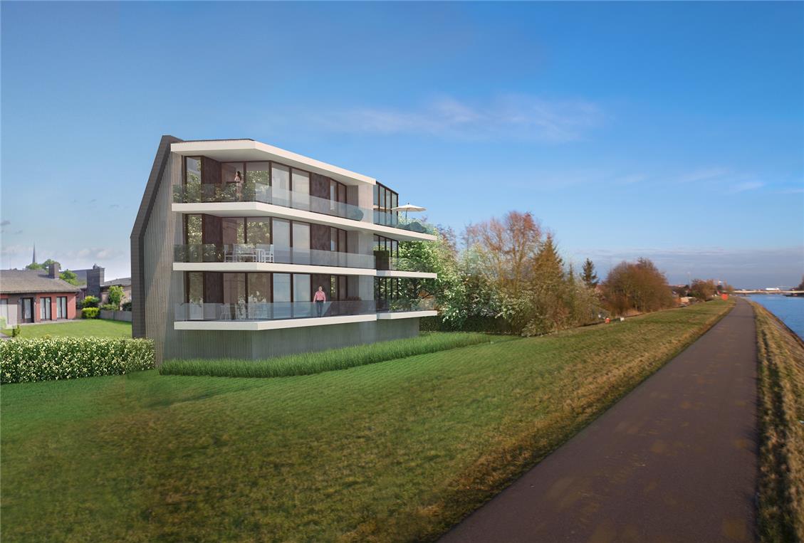 Massenhoven. Vogelzangstraat. De zijde van het Albertkanaal. Wonen met zicht op het water. In de sokkel van het gebouw bevinden zich inkom, garages en bergingen. Er wordt gewoond vanaf de eerste verdieping. De appartementen zweven als woonplateaus boven de kanaaldijk.